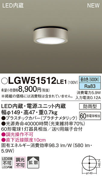 エクステリア 屋外 照明 ライト パナソニック(Panasonic) 軒下用ダウンシーリング LGW51512LE1 プラチナメタリック 昼白色 天井直付型LED(昼白色) ポーチライト 拡散タイプ 防雨型 白熱電球60形1灯器具相当