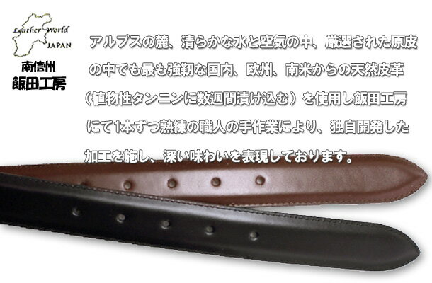 アルプスの麓、清らかな水と空気の中、厳選された原皮の中でも最も強靭な天然皮革を使用し、飯田工房にて1本づつ熟練の職人の手作業により加工を施し深い味わいを表現しています。