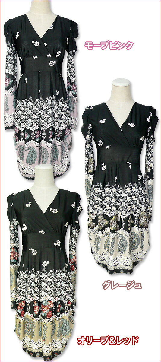 在庫限り【上品ローズ柄】ヨーロピアンフラワー柄エステルドレス♪上品なカシュクールデザインの大人ワンピース♪【花柄・バラ柄・アンティーク・クラシック】[春物][秋物]